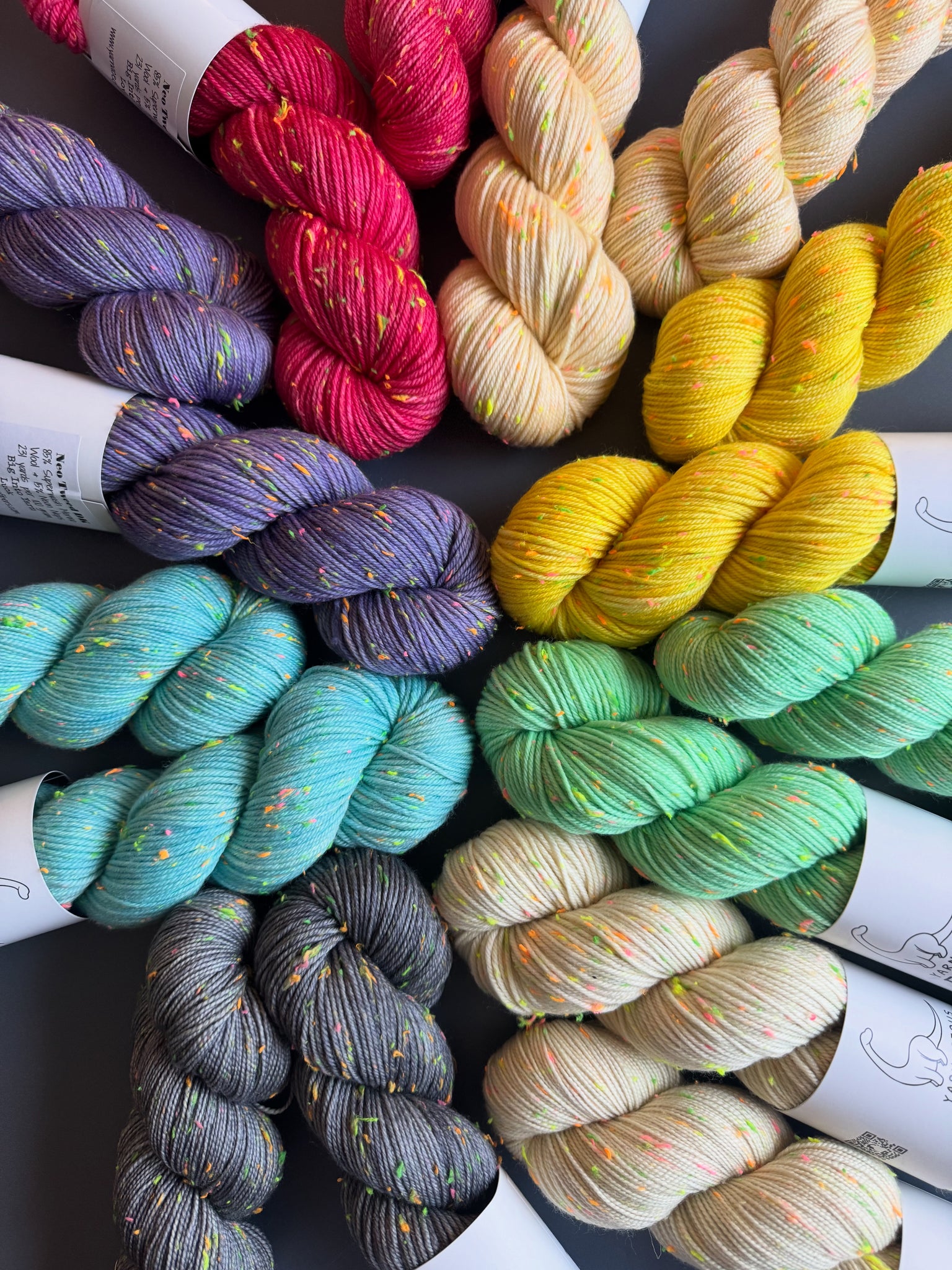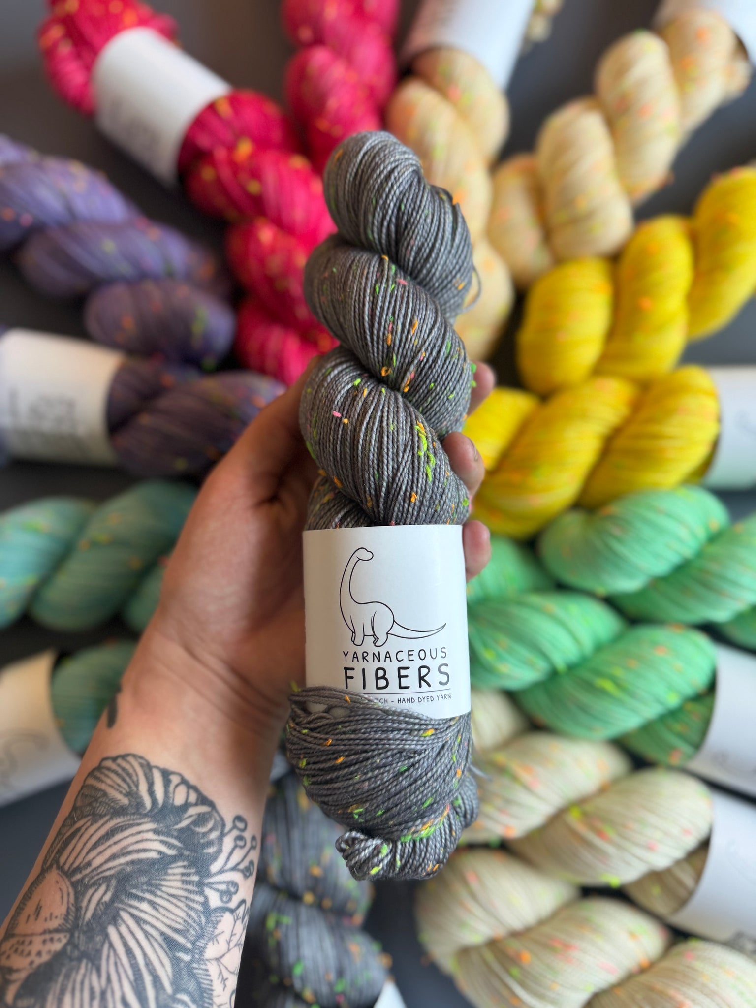 Neo Fingering: 85% Superwash Merino & 15% Nylon. 437 yards per 100 gram.