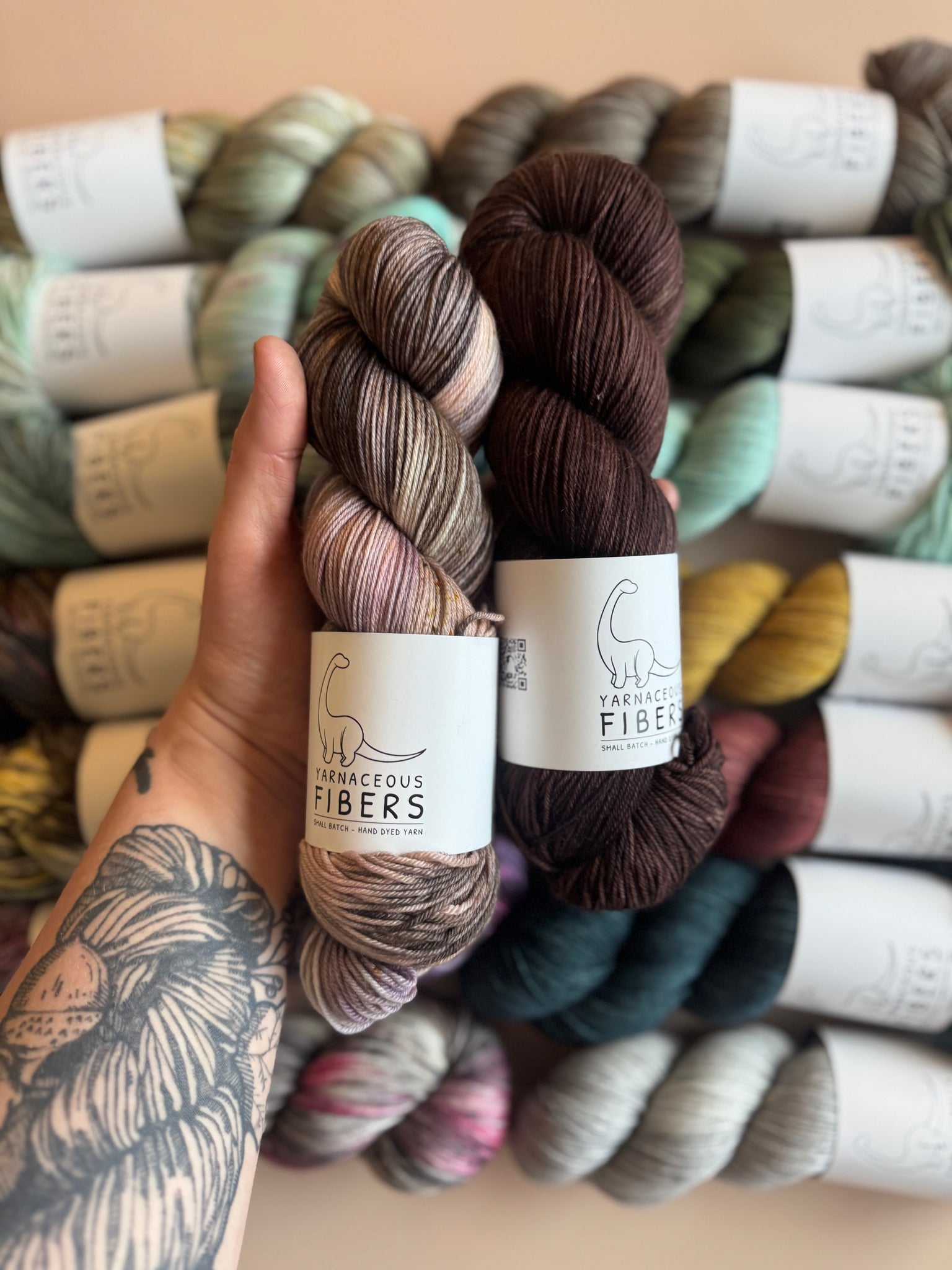 Salta Fingering: 85% Superwash Merino Wool & 15% Nylon. 437 yards per 100 gram skein.