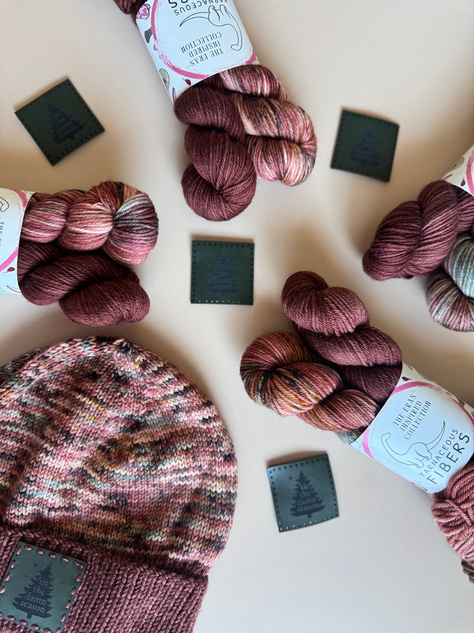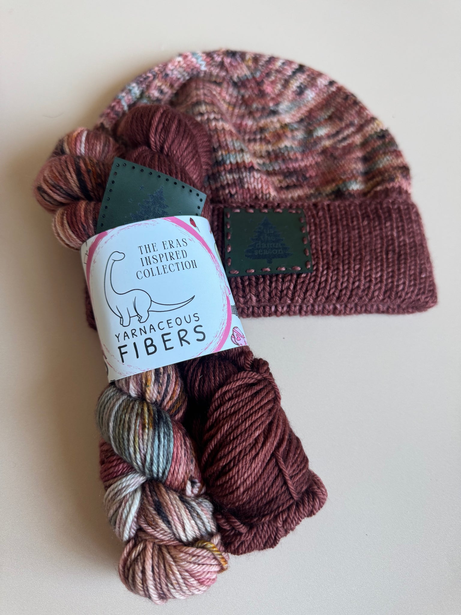 Our Hat Sets are perfect for knitting yourself a Tailor Swift Eras Inspired Beanie! Each set comes with a 50 gram skein of Evermore and 'Tis the Damn Season and a "'Tis the Damn Season" hat tag.