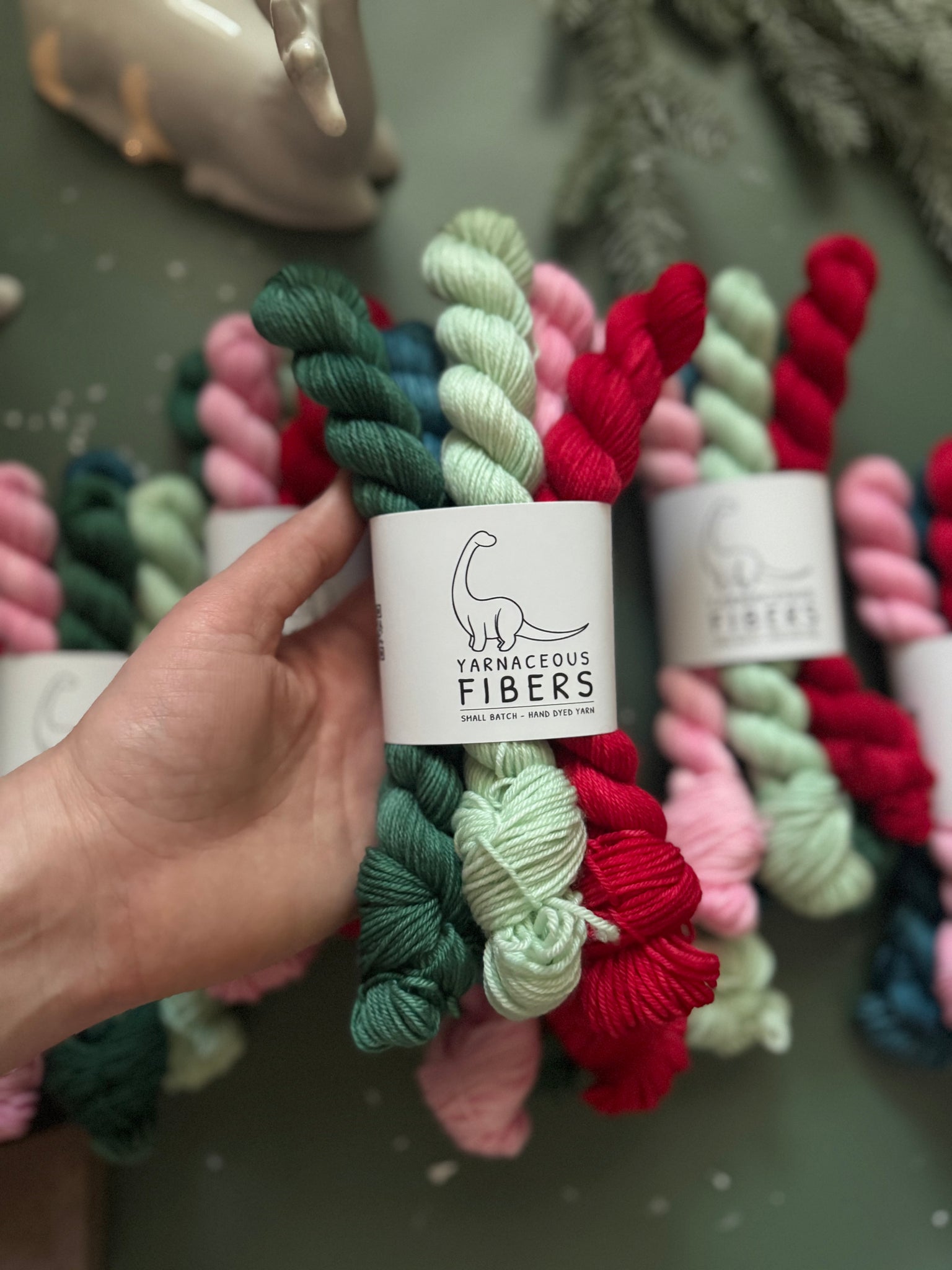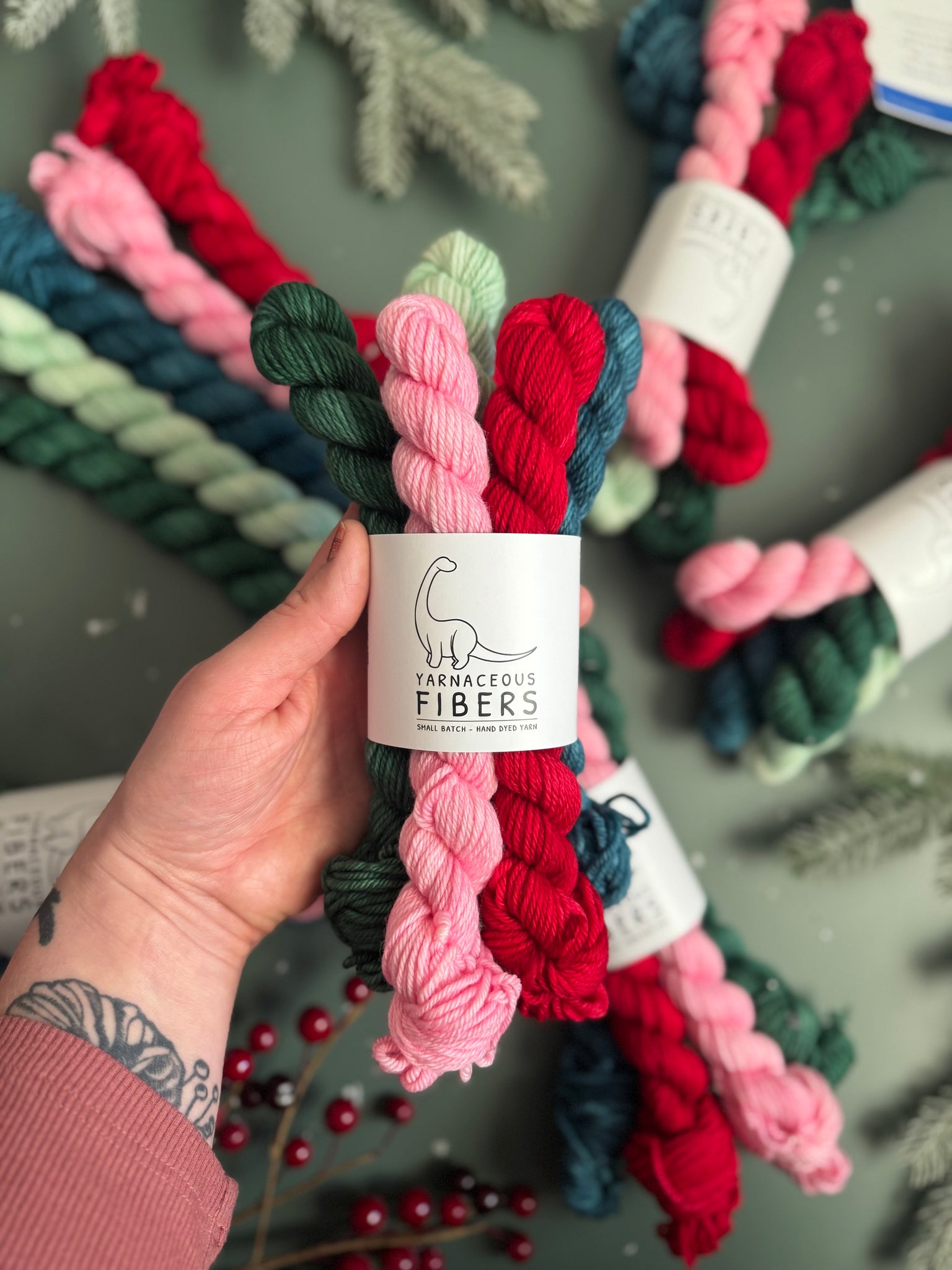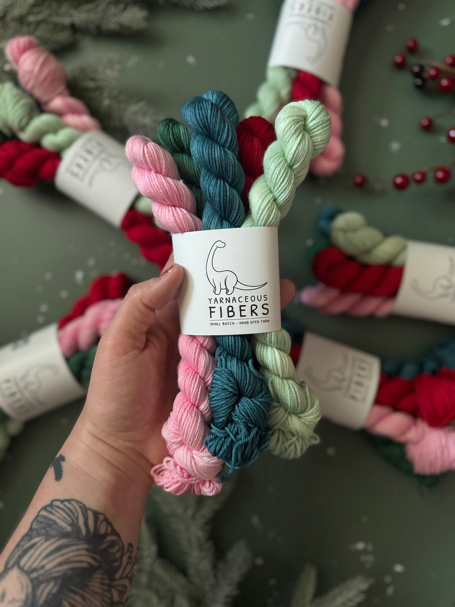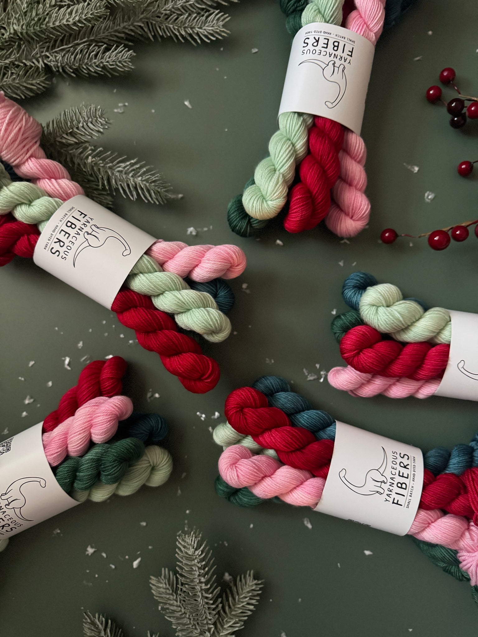Each set includes 5 20 gram mini skeins inspired by the holidays. Tonals included are the contrast tonals of our Winter Wishes Sock and half skein sets.