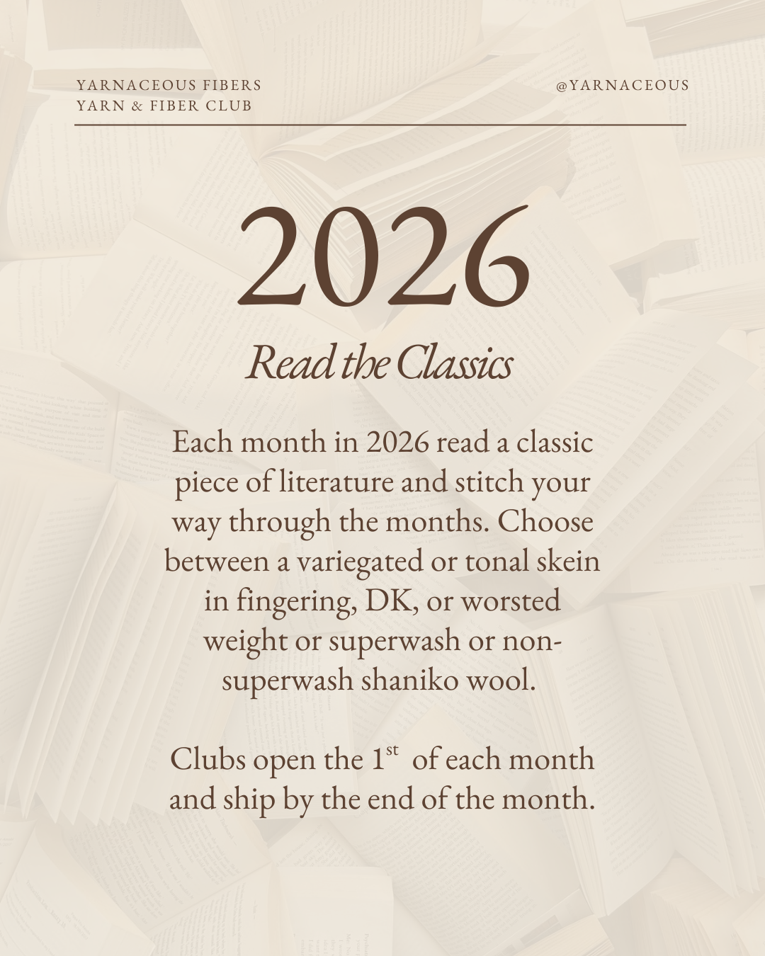 Subscribe in January for 10% off each month and an automatic charge (to be billed on the 1st of each coming month). Worried about commitment? Each month can be purchased separately from the 1st to the 15th! This year's club includes a yarn or fiber option, comes with stitch marker and a post card about that month's book. Clubs are dyed after they close and will ship by the end of the month.