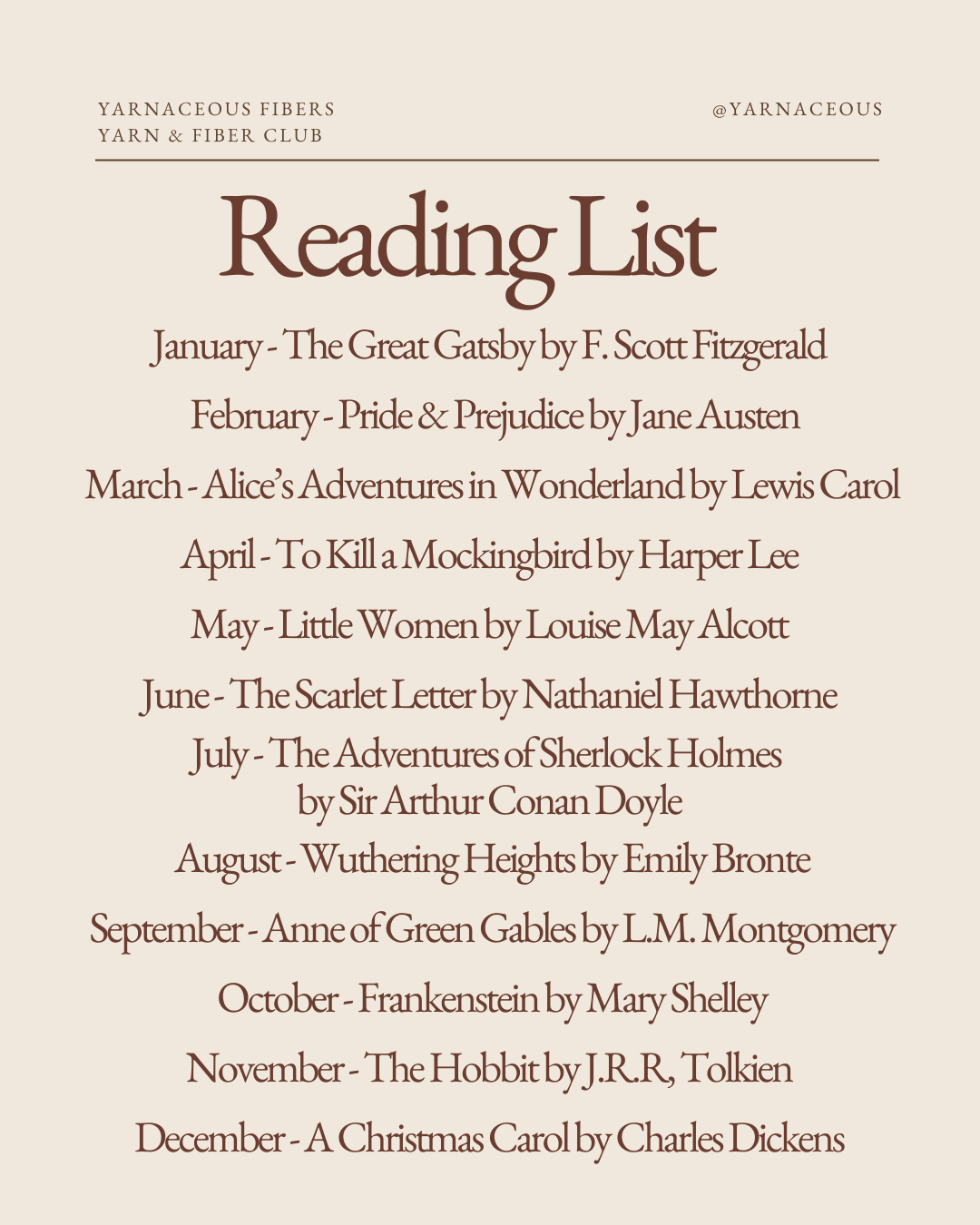 A literary-inspired yarn and fiber club celebrating timeless classics. Each installment draws from iconic novels like The Great Gatsby, Pride & Prejudice, Frankenstein, The Scarlet Letter, and Little Women, translating beloved stories into rich colorways and thoughtfully curated fibers made for mindful making and devoted readers.