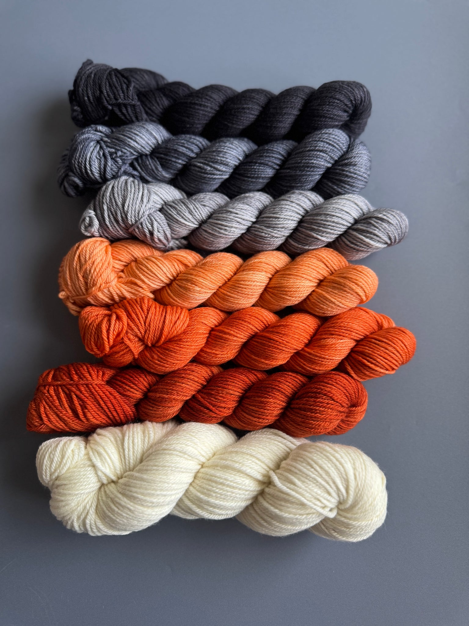 220 Gram Kit includes one full skein and 6 20 gram skeins. Ideal for a smaller project like the Doodle Hat, socks or single sided infinity.